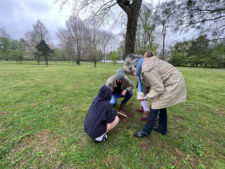 There is a creek that runs through the park directly across from their house. The neighborhood historian explained to us that the Confederate soldiers encamped on one side and the Union soldiers on the other. In the evening they would gather at the creek to trade coffee for tobacco, and paper and pens to write letters home. In the morning they would go back to killing each other. He pointed out the berms still visible where the soldiers would dig trenches and pile dirt in front of them, now covered in grass and barely perceptible. Our historian disappeared into his house and returned with a glass display box with six Civil War bullets he recovered from his backyard next to the battlefield.