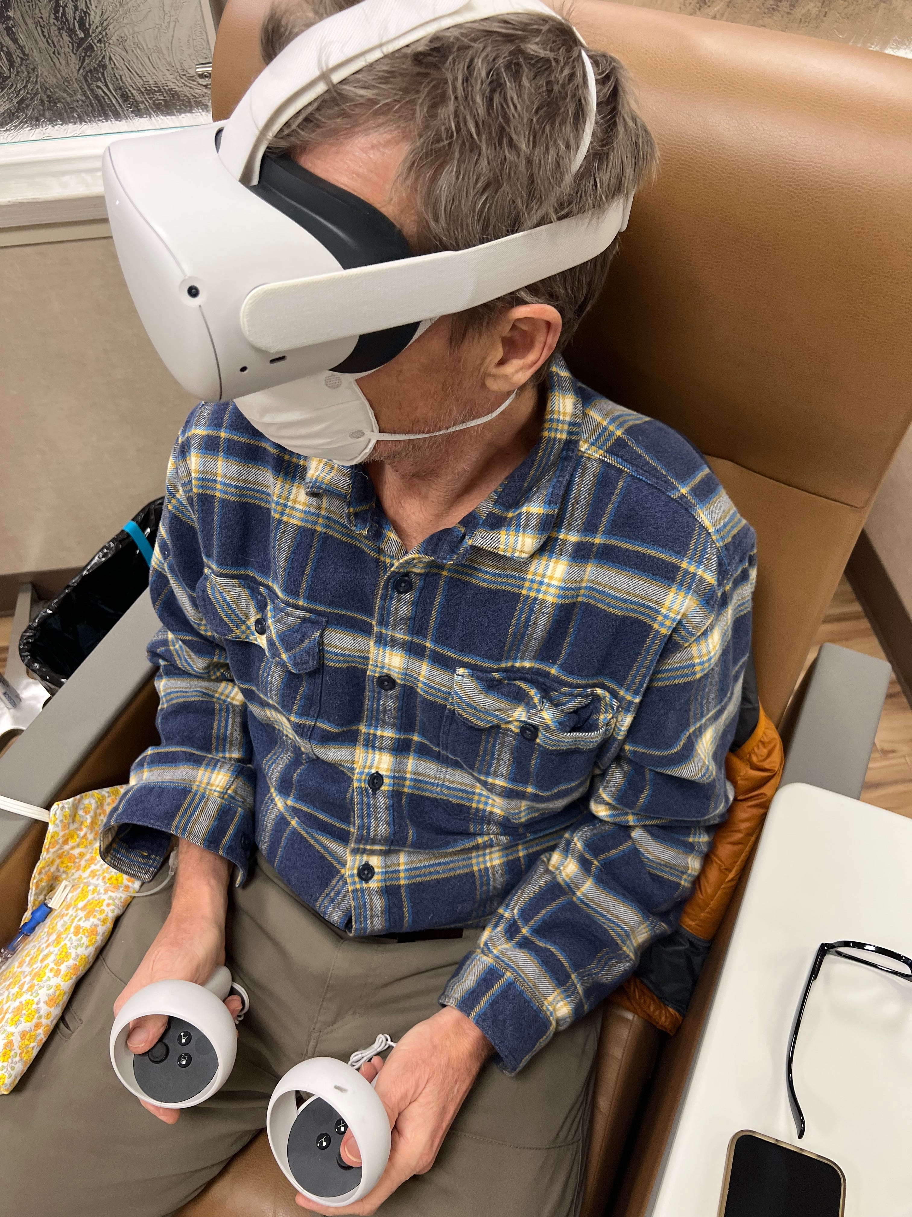 The oncology nurse asked which arm I preferred to insert the IV needle to start the medicine flowing into me. Once positioned, I put on a VR headset to escape the medical ambience of the infusion clinic. With my hand-contoller I clicked on the nature video my son, Nils, shot and loaded to the headset for me. A waterfall in a green forest appeared before me and the sounds of water and birdsong accompanied by ethereal music took me to a meditative state far from the cancer clinic. I was connecting to the healing power of Mother Nature in a meaningful way, a visual meditation to help welcome this magical fluid, this immunotherapy, into my body as easily as the water flowed from the falls, down the mountain, and eventually back into the ocean.